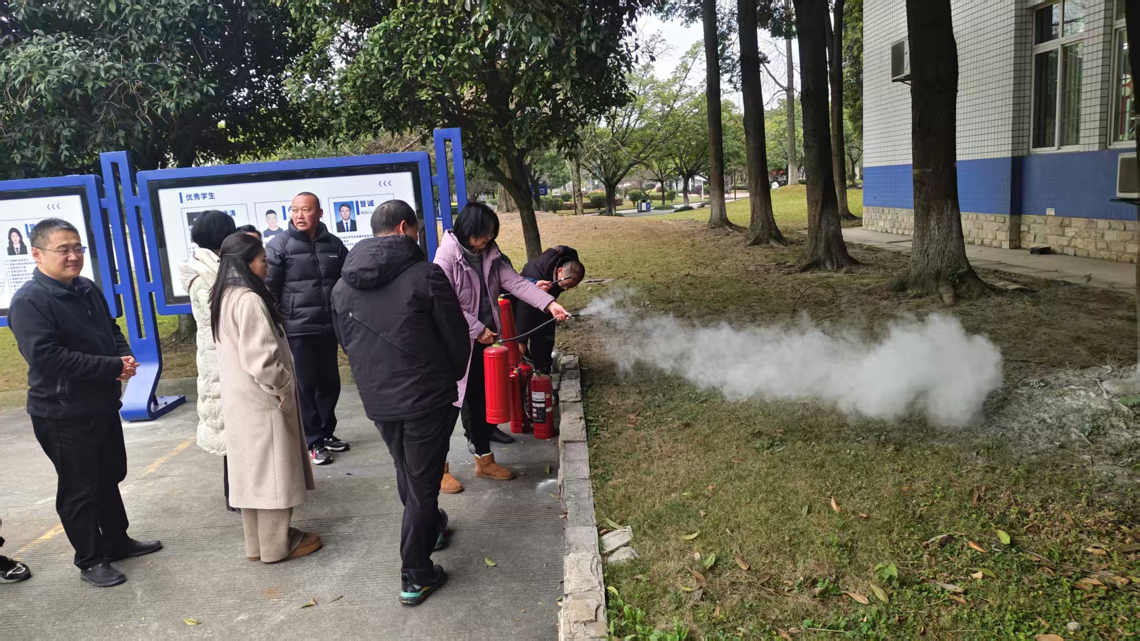 撤离至安全区域后,演练进入实践操作环节。工作人员现场演示了干粉灭火器的使用方法,详细讲解“提、拔、握、压”的基本操作要领,并强调站在上风处、保持安全距离等注意事项,部分师生还在指导下进行了实操体验,切实掌握灭火技能。